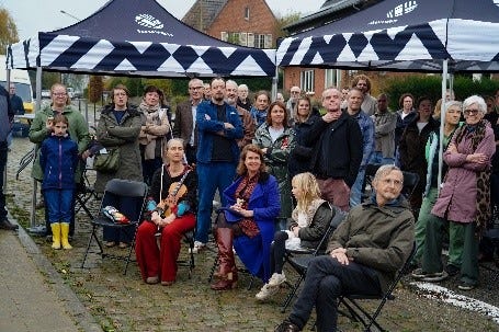Op 15 november verzamelden ruim tachtig mensen om de opening van onze eerste twee woningen in de Galgebergstraat mee te vieren. Onder de sprekers waren Lies Corneillie, Frank Vandenbroucke, Hilde Beckers en Danny Wildemeersch. Evelien Willaert en Lieve Polfliet knipten het lint door en plantten twee appelbomen als symbool voor groei en nieuwe kansen.